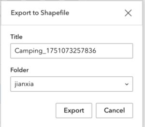 Please be aware that when you export all data to these formats, files will be downloaded directly to your computer. However, if you are exporting selected data, you need to have a user type that grants you the privileges to create content. This process first involves creating an item in your ArcGIS account as shown below, followed by downloading the files to your computer. There is no credit consumption. For more information, see Export settings.