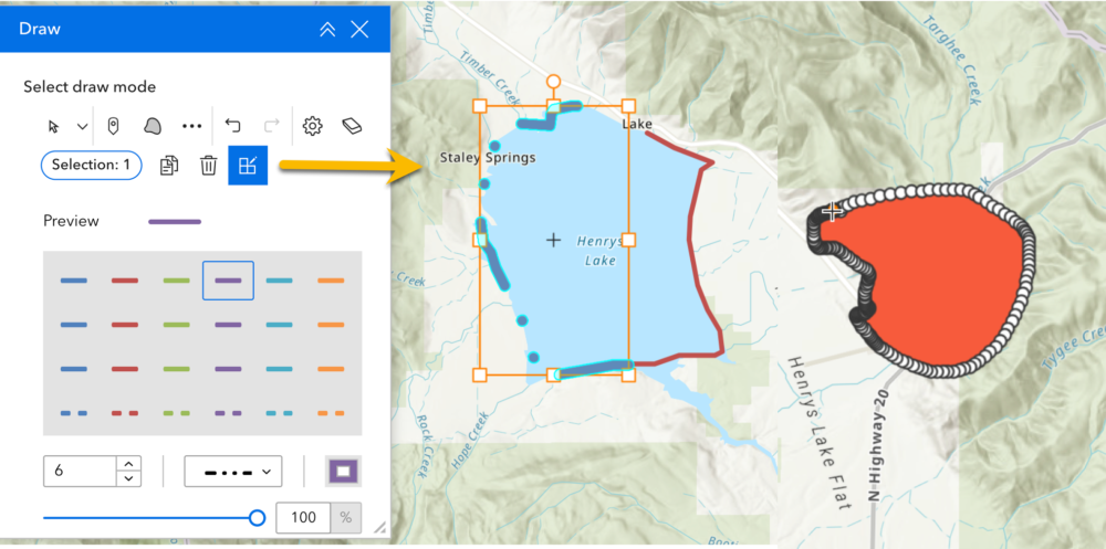 You can use the freehand tools to draw polylines and polygons on the map. You can also adjust the symbology of previously drawn graphics by changing their color, size, or style.