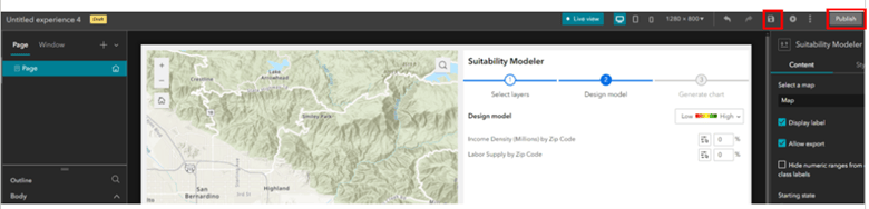 Now that you have created this experience you can share it with others for use. The end users of your modeling experience will have the following options when modeling with Suitability Modeler in Experience Builder: