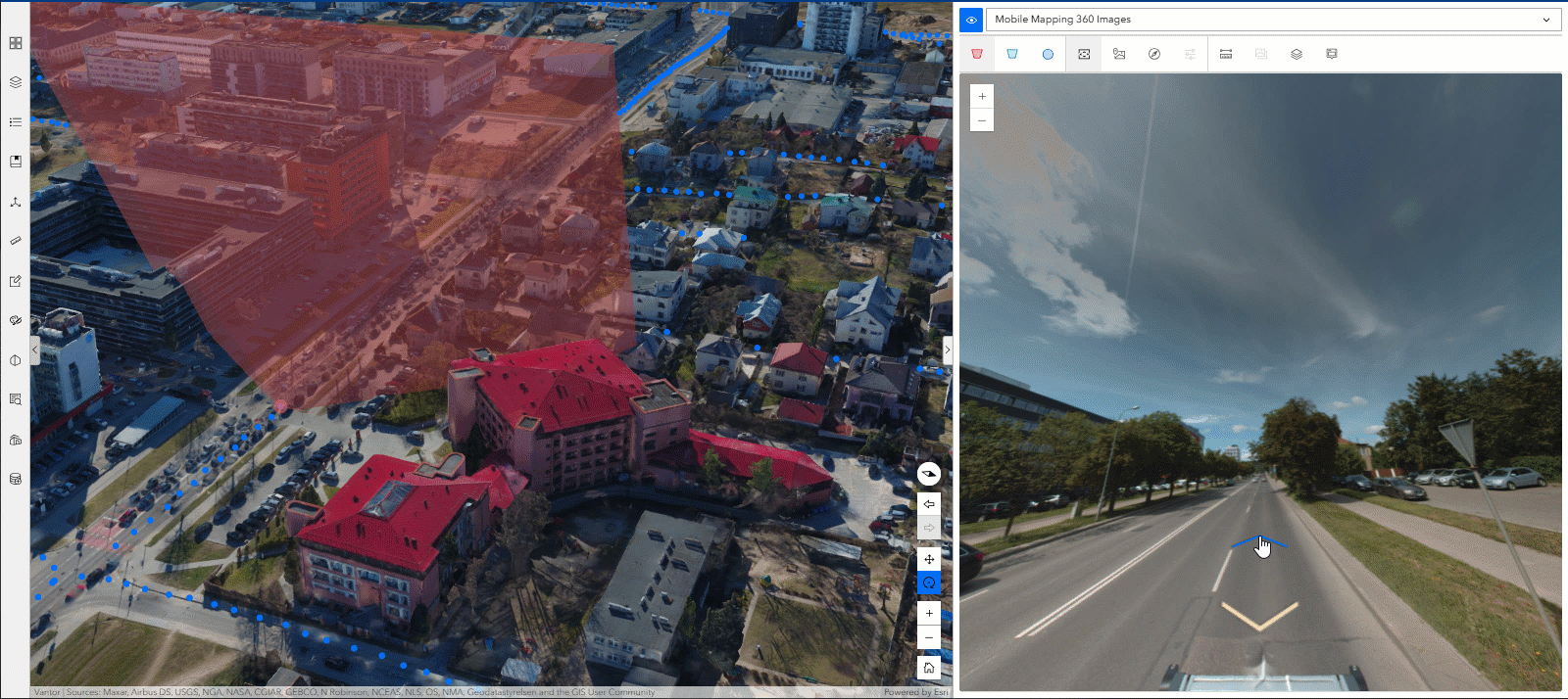 - Allows you to have immersive experiences with imagery captured from any angle—including oblique, bubble, street-side, inspection, and 360-degree images—in a 2D map or 3D scene