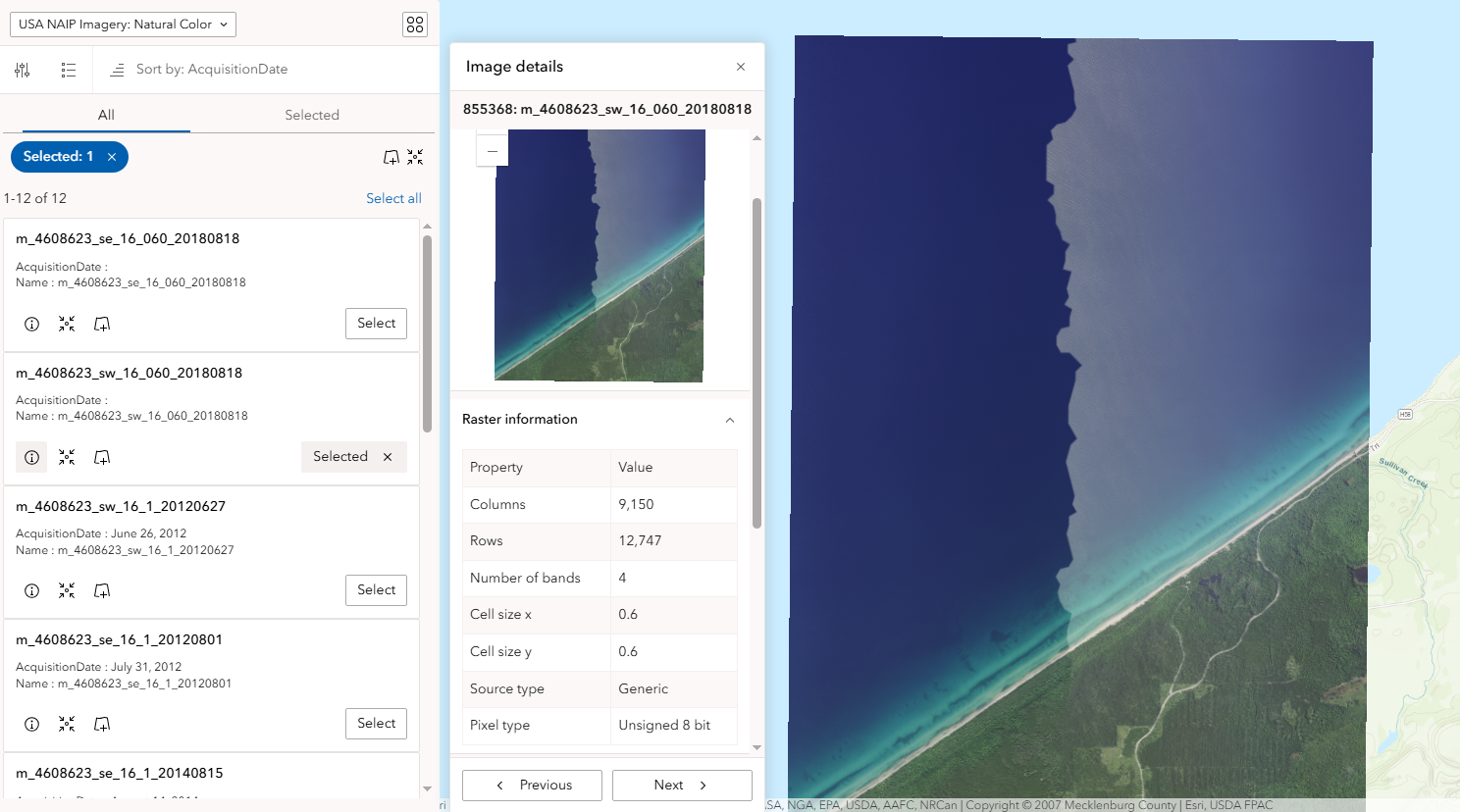 The Image Collection Explorer widget allows you to view all of the individual images in an image collection from a dynamic imagery layer. You can view the image metadata and filter by area of interest or attributes like acquisition date and cloud cover to find a specific image and then create new imagery layers from your selection. Subsequently, this allows you to find more targeted imagery data and get the insights you need faster.