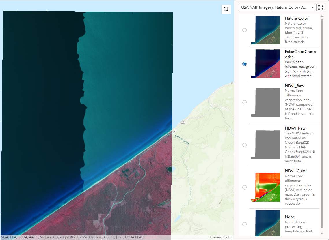 The Processing Templates widget applies raster function templates to imagery layers to automate analysis workflows. These reusable templates contain one or more chained raster functions and can be created in ArcGIS Pro or ArcGIS Online using the Raster Function Editor. The widget enables you to dynamically transform imagery displays, detect changes between images over time, or apply multiple raster functions in a single operation. For example, you can use the same template to measure terrain burn severity each time new images are collected after forest fires, eliminating the need to recreate the process.