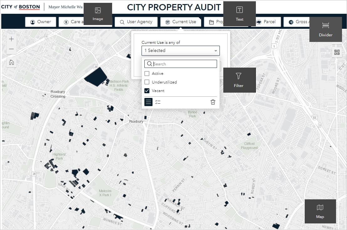 What I really love about Experience Builder for this implementation is that I was able to bring the City of Boston’s unique branding into the application interface without compromising on complex filtering functionality. Not only are the Experience Builder filters responsive to one another, but they aren’t locked into any predefined arrangement. I also really appreciated the ability to construct a mobile layout of the application so we could be confident that constituents would be able to explore on any device.
