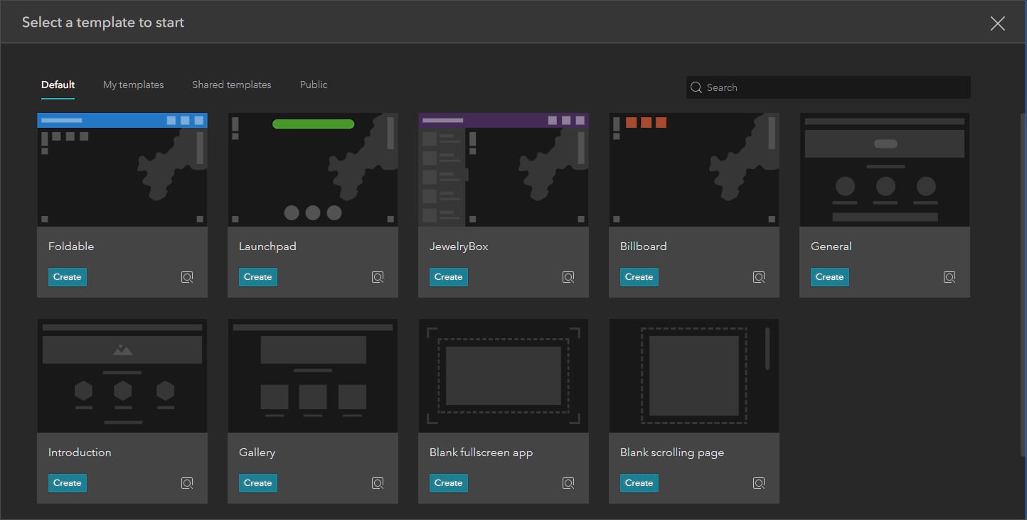 The template gallery contains the default templates, as well as templates that you’ve created, those shared with you, and public templates, including those found in ArcGIS Online and ArcGIS Living Atlas.