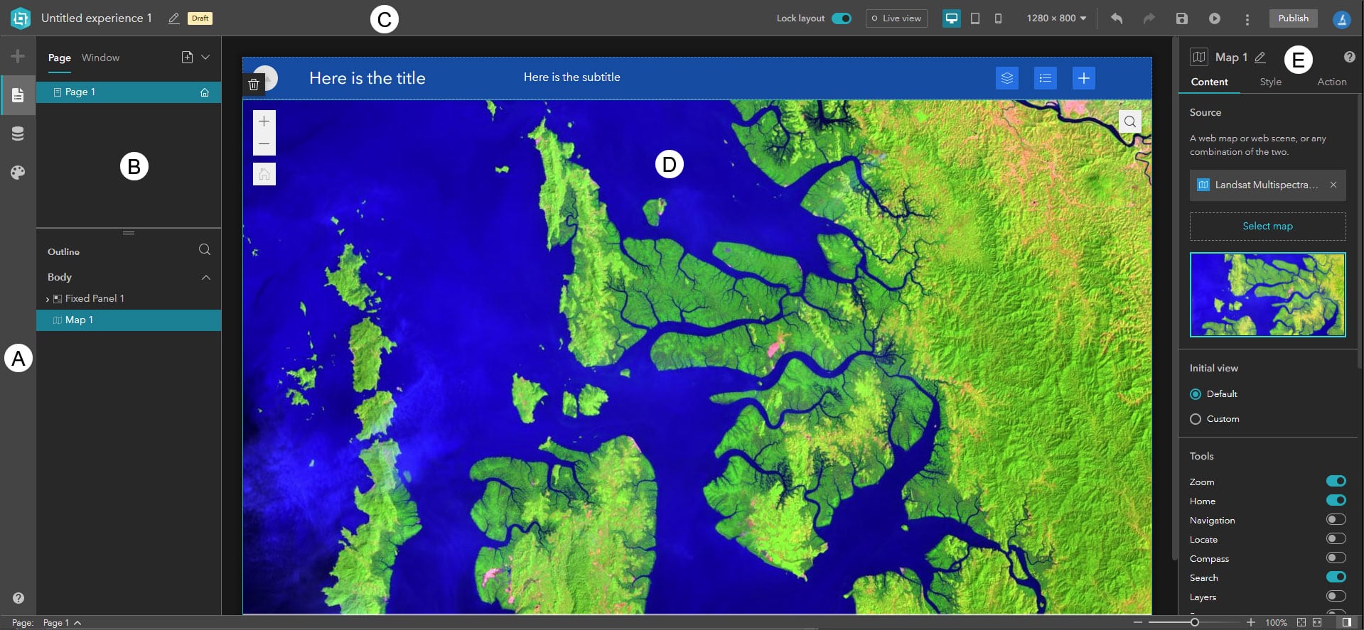 C – The builder toolbar displays tools that you use to lock the layout, preview your experience, save, undo/redo, publish, and more.