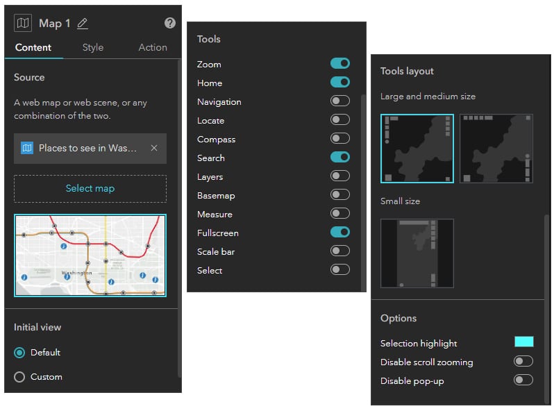 Content is what’s in a widget; the text string in a text widget, the layers in a map layers widget, or the map in a map widget. Shown below, the Content tab in a map widget shows the map that the widget contains, along with properties you can toggle and set.