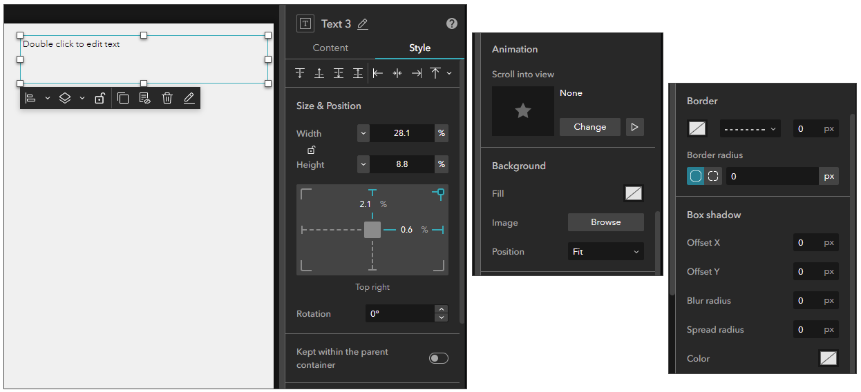 The Style tab enables you to change the widget appearance. The example below shows the style properties available for a Text widget.