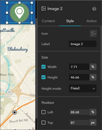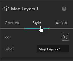 Content is what’s in a widget; the text string in a text widget, the layers in a map layers widget, or the map in a map widget. Shown below, the Content tab in a map widget shows the map that the widget contains, along with properties you can toggle and set.