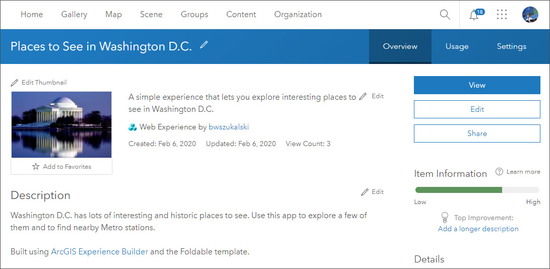 It’s a best practice to complete the item details for the experience by adding a summary, description, and thumbnail. You can edit the name, title, and thumbnail by clicking more options on the experience card, and selecting Edit info, or edit the item pages by clicking View details.