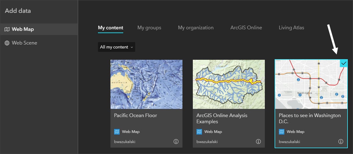 Add data displays available maps. If you have saved the example map used in this tutorial, locate it and click to select it, or choose any map you have. The selected map will display a checkmark.