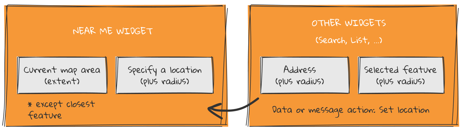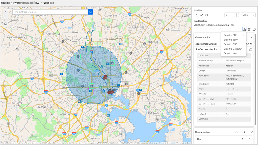 The Near Me widget in Experience Builder quickly answers location-based questions. It can help you find and analyze features within a specified distance from various inputs, such as an address, selected features, a sketch, or the current map extent.