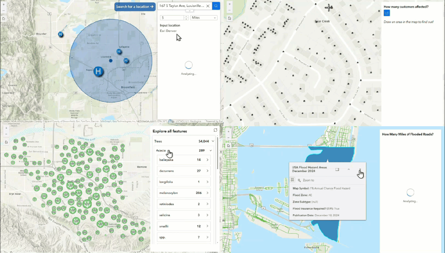 | Find the nearest Park from a sketched location in the map. | Determine which customers are impacted in an outage area. | View a list of all National Parks in the United States and group them by state. | Identify how many miles of roads are flooded. |