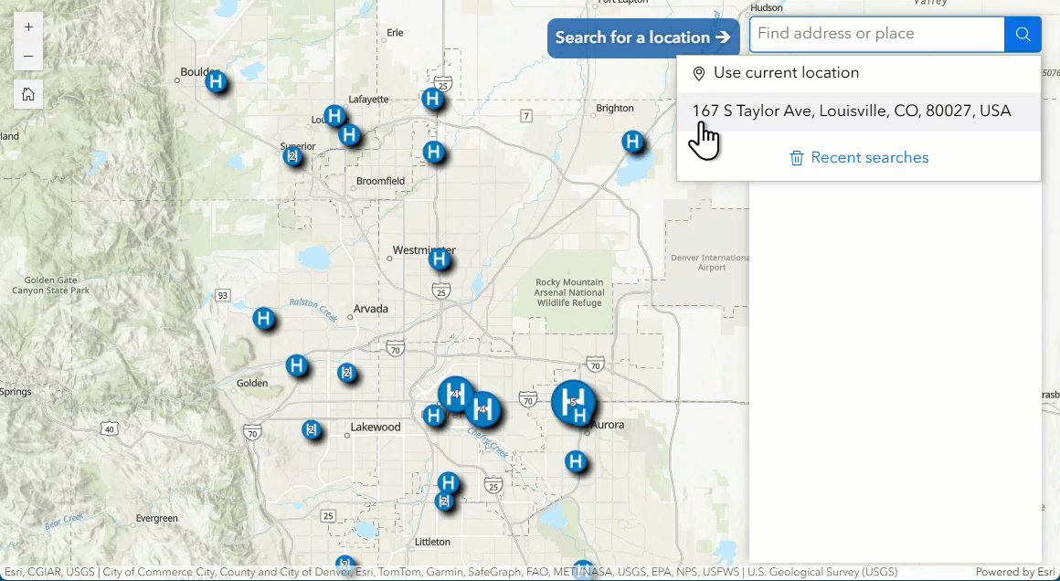 In this app, you can type an address in the Search widget and automatically get results for the nearest hospital within 5 miles of the searched location.