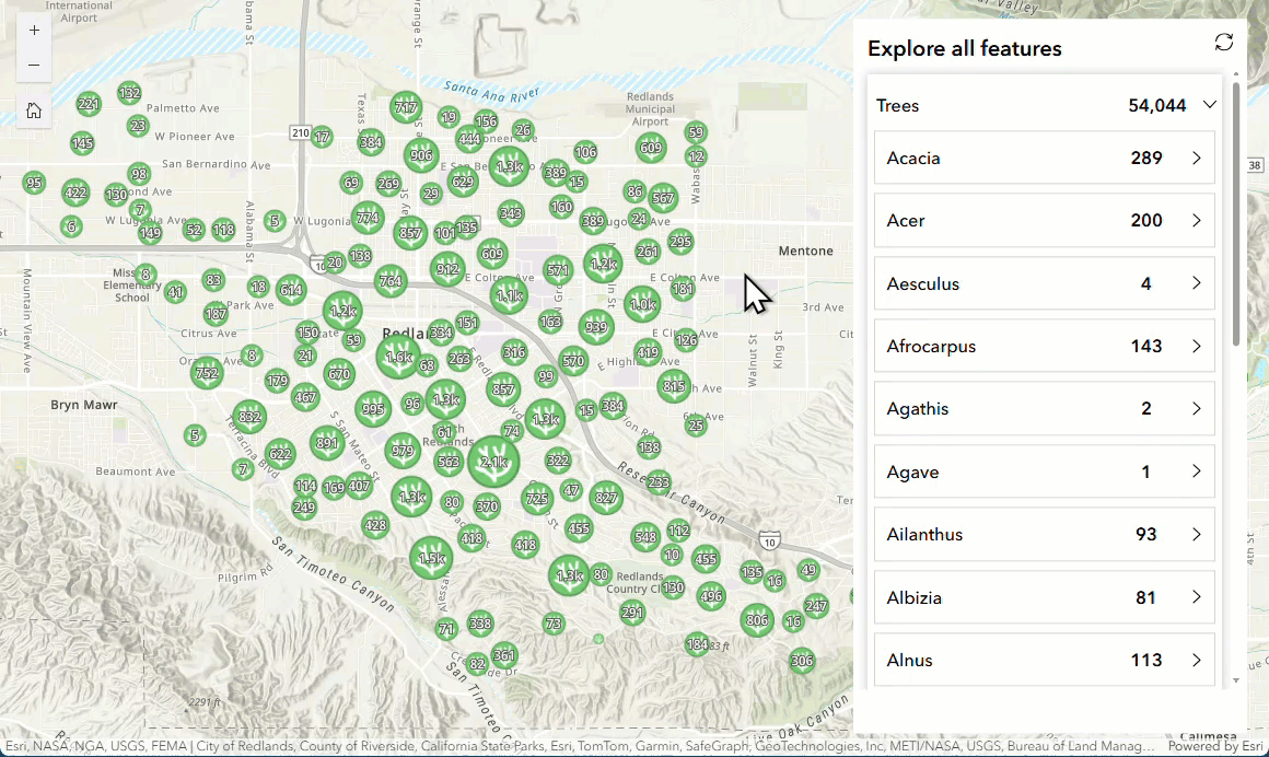 In this app, you can view a list of all tree features from a layer in the map, grouped by genus and species.