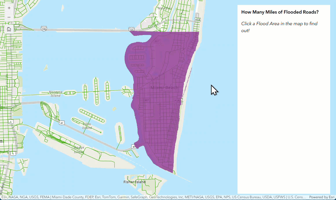In this app, you can select a flood area and receive a summary of the total length of all roads that intersect with that area.