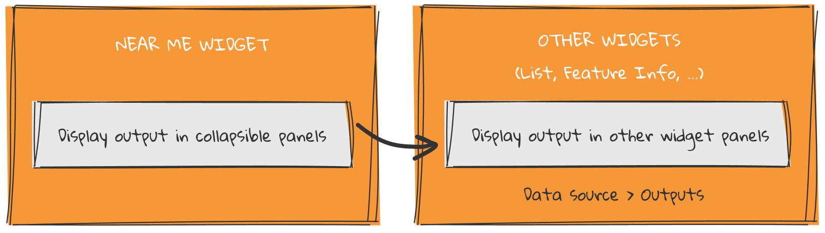 Choose to display the results within the Near Me widget panel with groups, counts, and symbols, or configure the output data source as an input for other widgets to customize the display of the results.