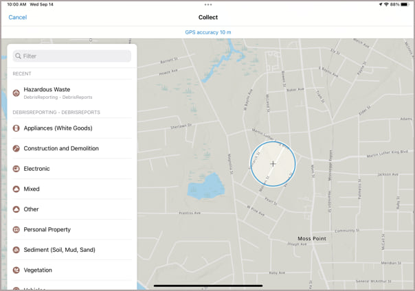 Tap on the Debris Reporting map card to open it and start capturing debris. If you are in an area with an unreliable internet connect, you can create an offline map area and download it to your device to collect data offline.