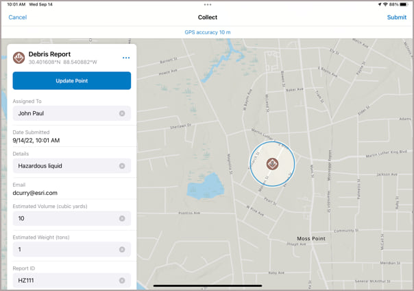 Field Maps automatically uses your GPS position as the location of the debris report.