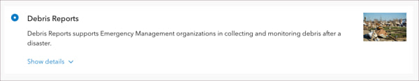 Debris reporting is a solution that supports emergency management organizations with collecting and monitoring debris after an emergency event. You can learn more about this solution on the Emergency Management site.