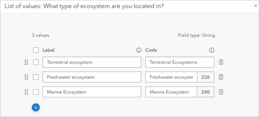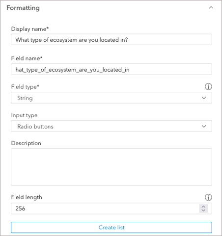 For display name, type What type of ecosystem are you located in?. Select String from the Field type drop down menu. Next, select Create list to add a list of choices for this question.