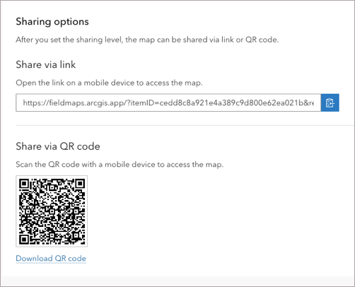 Under Sharing options, Field Maps generates a link and QR code students can click on or capture to access the map on their mobile device. Embed the map link and QR code into your Story to make it readily accessible to your students.