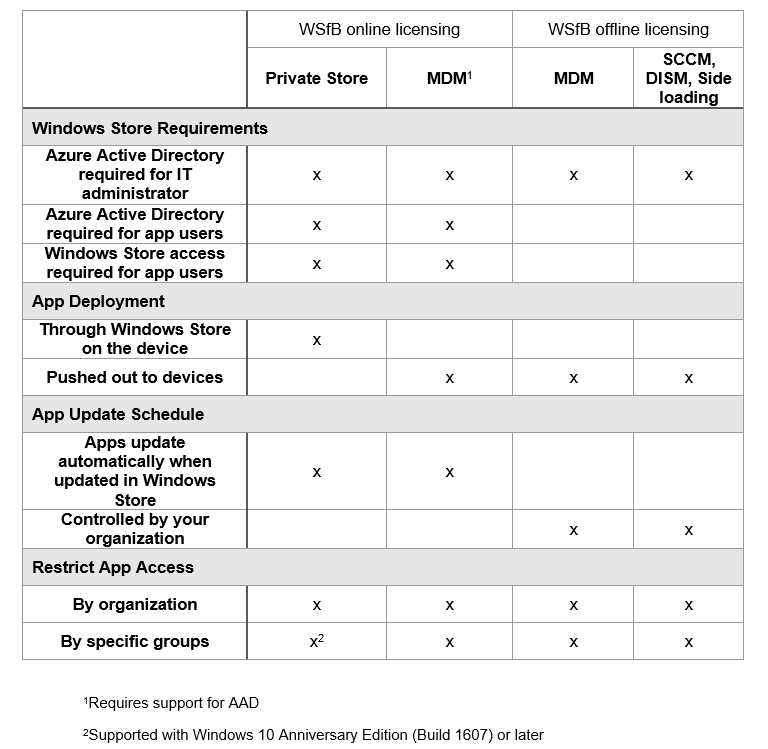 The WSfB supports two main licensing models: online and offline. Online licensing requires an Azure Active Directory (AAD) account for each employee, and requires access to the Windows Store. Although access to the Windows Store is required, it is a deployment option worth considering as it provides the organization with the control to Store content that some of them require. Offline licensing, on the other hand, allows the organization to use any identity provider and doesn’t require any Store access for users of the app, but requires more effort on the part of your IT staff.