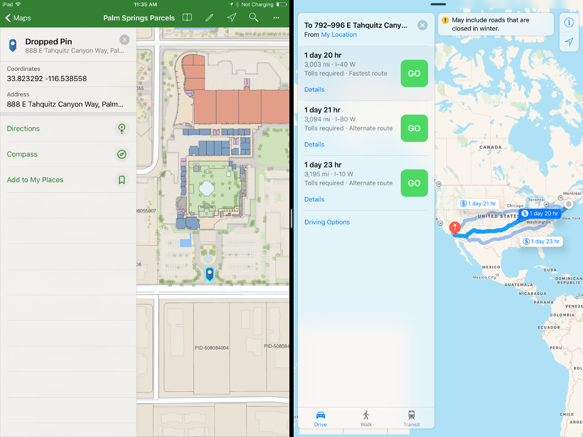 Side panel and split screen In our last beta release, tapping the map or searching for a feature slid a panel from the bottom of the screen on both iPads and iPhones. In this update, the panel now makes better use of your screen on iPads and is fixed to the side of the screen. You can now use the app side-by-side with other apps you are working in, as we now support split screen view.