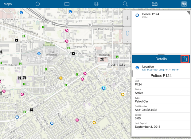 You can also plan routes to features in Collector because it is integrated with Navigator for ArcGIS. Navigator is an app available on the iOS platform that enables you to receive voice-guided, turn-by-turn directions to one or more stops, access downloadable maps for offline navigation, and select preferred travel modes such as walking, trucking, or driving. Say you want to get directions to a particular police station. Simply tap on that station so that its details appear and then tap on the Action icon in the Details dialog box.