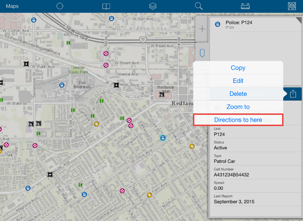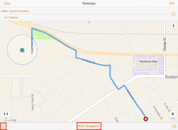 Navigator will automatically launch and calculate a route from your current location to the selected feature. You can see turn-by-turn directions to the police station by tapping the Directions icon and get voice-guided directions by tapping Start Navigation.