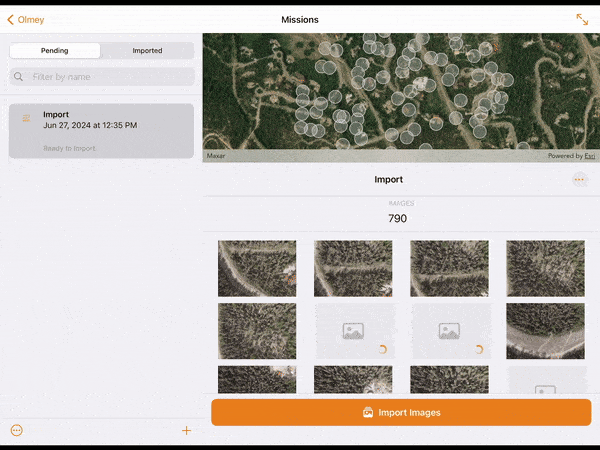 14. Choose your desired method and select Import. Import progress for each image collected will be visible in the lower window. When imported, the images will appear in the upper map window in their real-world location.