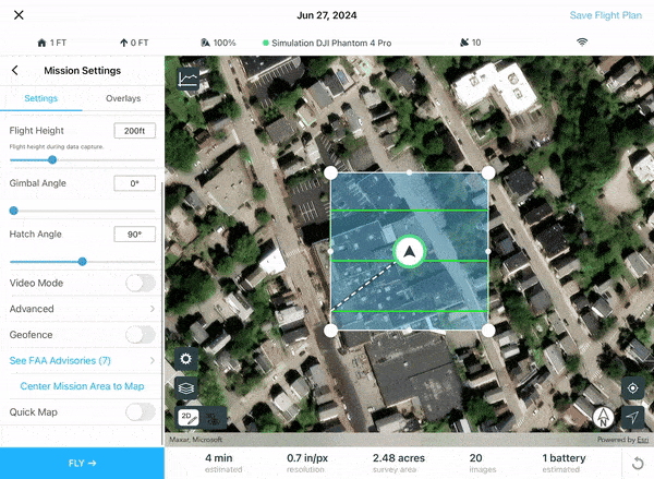 8. Use the Mission Settings tab to customize the parameters governing your drone flight (flight height, video mode). Drag and move any of the vertices of the flight polygon to change the shape of the mission area.