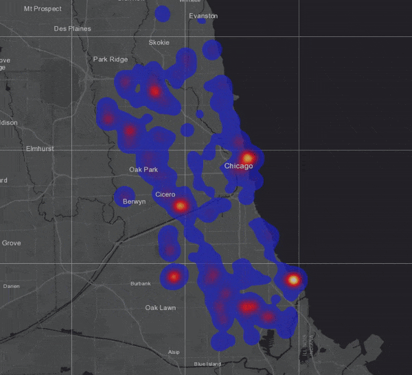 To visualize the result, I chose to symbolize on location only and selected the “Heat Map” option (not to be confused with hot spots!):
