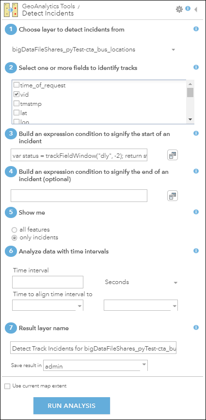 I used the Map Viewer in ArcGIS Enterprise to do this analysis. Map Viewer is a browser-based interface for performing analysis – one of many ways to access GeoAnalytics tools. After I finished filling out all of the required parameters, the tool looked like this: