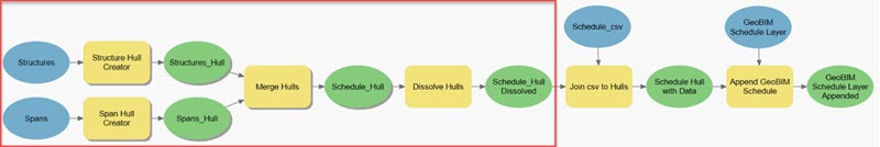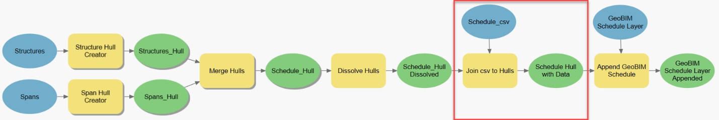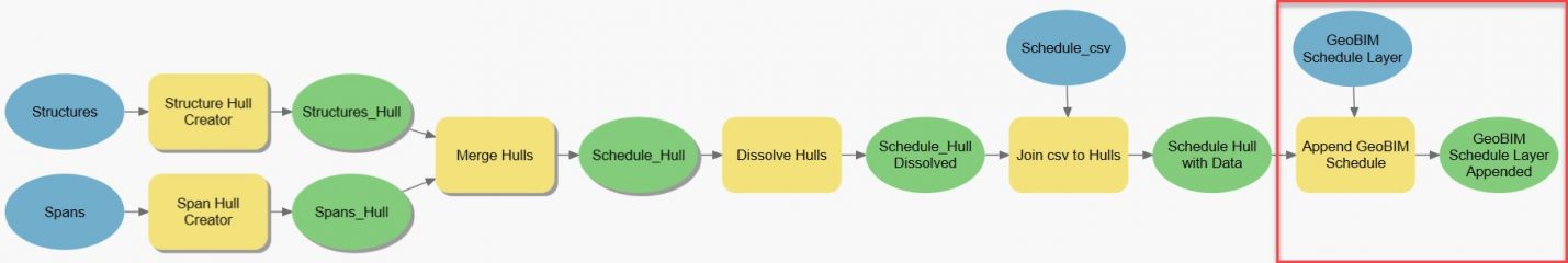 This section of the model uses the combined polygon and schedule data to update the ArcGIS GeoBIM schedule layer in the ArcGIS GeoBIM project.