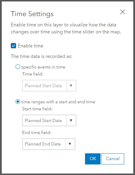 After the append is complete in ArcGIS Pro, update the Schedules layer time extents by opening the time settings in ArcGIS Online and clicking ok