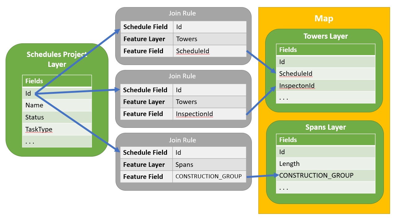 joins an activity’s “Id” field to the “CONSTRUCTION_GROUP” field in the “Spans” feature layer with the ID and URL shown. A GeoBIM project can have many Schedule Feature Rules, all of which are created and maintained by the user (see Linking Schedule Data to GIS Features).