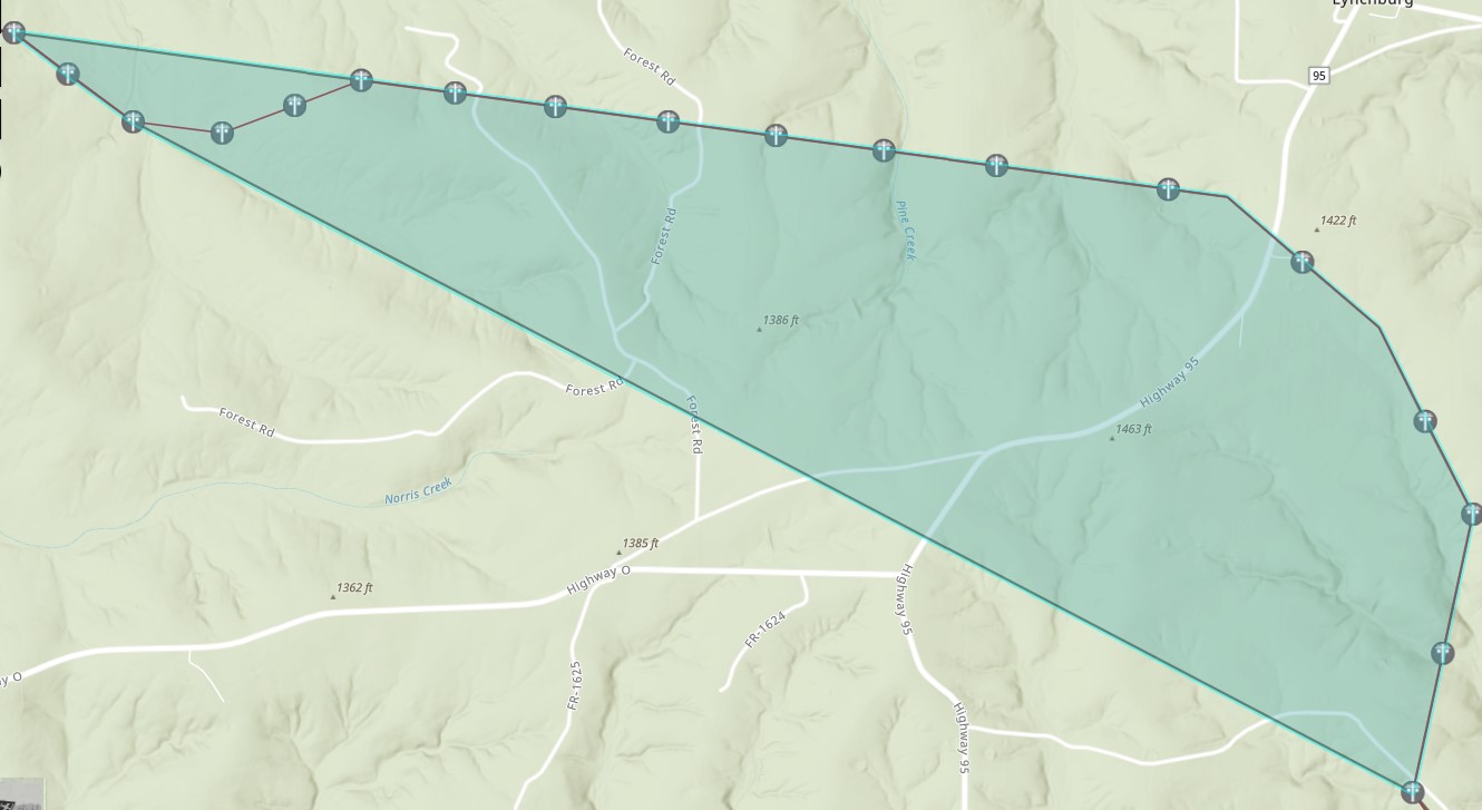 As an example, imagine a user who defines two join rules for their Schedules layer. The rules link the Schedules layer to two user-defined GIS layers, depicting the towers (points) and spans (lines) of a transmission line project. During import of Schedule data in ArcGIS Pro, a convex hull polygon would be created for each activity in the Schedules layer that encompassed all towers and spans linked to that activity. After import, if one were to view the towers, spans, and Schedules on a map, then the polygon for a single activity might look like the image below: