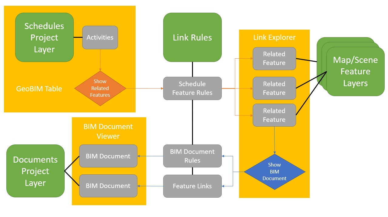 Once the Schedules project layer has been created and the associated Link Rules defined, you can use an ArcGIS GeoBIM App to examine all spatial features related to an Activity. The App’s Show Related Features function uses the Schedule Feature Rules to select all features related to an Activity at once. From there, you can step through each related feature using Link Explorer and view the feature’s BIM documents using the BIM Document Viewer. (The BIM Document Viewer uses the Feature Link Rules and BIM Document Rules that are also stored within the Link Rules table to locate the related documents). The Show Related Features workflow and how it relates to ArcGIS GeoBIM Schedules data is laid out below: