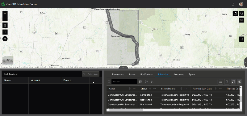 ArcGIS GeoBIM allows users to bring their schedule activities, GIS, and BIM project data together in one place. GeoBIM can leverage schedule data imported from ArcGIS Pro, link those schedule activities to user-defined GIS feature maps and scenes through custom link rules, and step through the related GIS features to link users to relevant BIM documentation. From disparate sources, ArcGIS GeoBIM allows users to bring their assets and project data all together in one place to share with stakeholders.