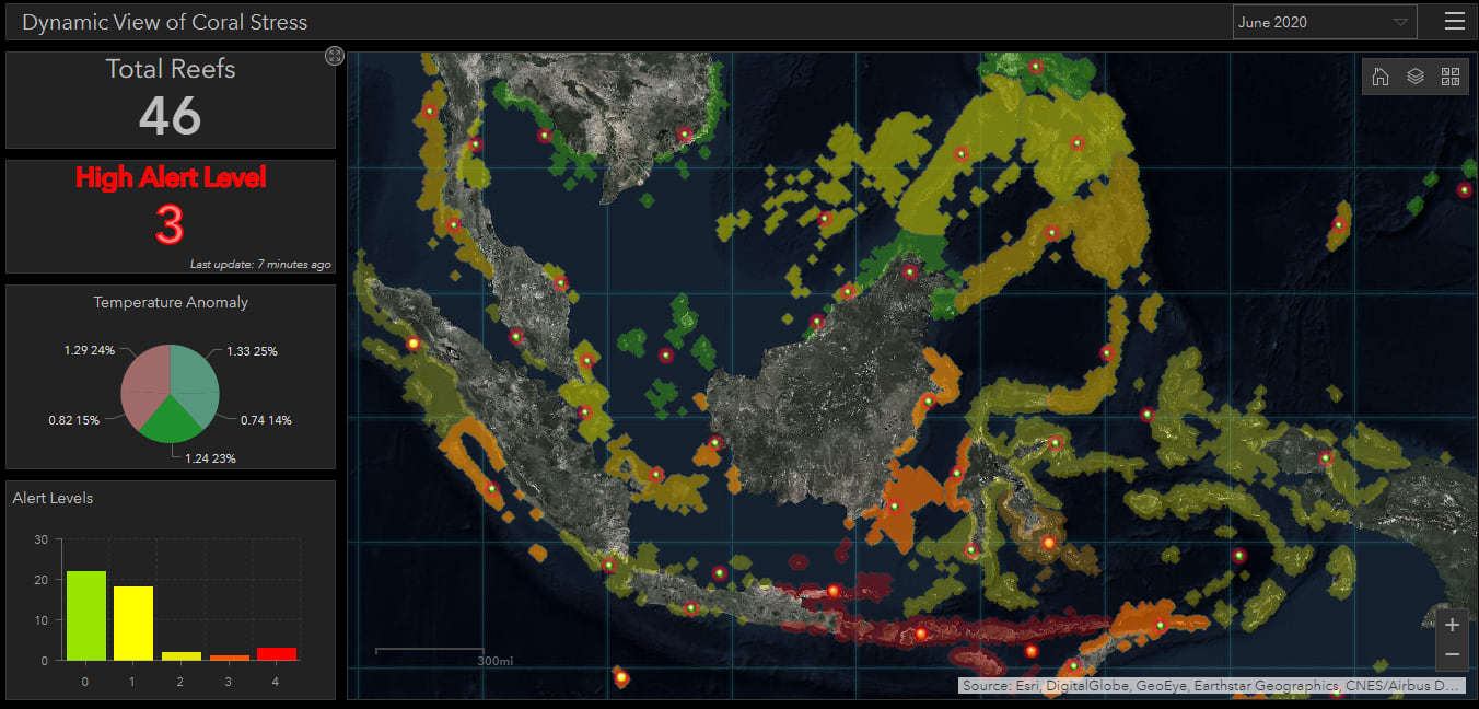 This high-level information can be communicated using an interactive dashboard which gives us a dynamic view of coral stress for varying periods of time predicted into the future.