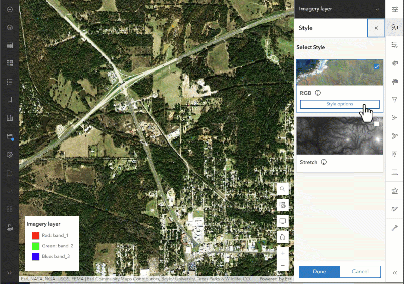- Time-Aware and Metadata-Driven Access: Show change over time by animating imagery of the area at different time periods (e.g., crop cycles or urban growth) using time-enabled imagery collections.
