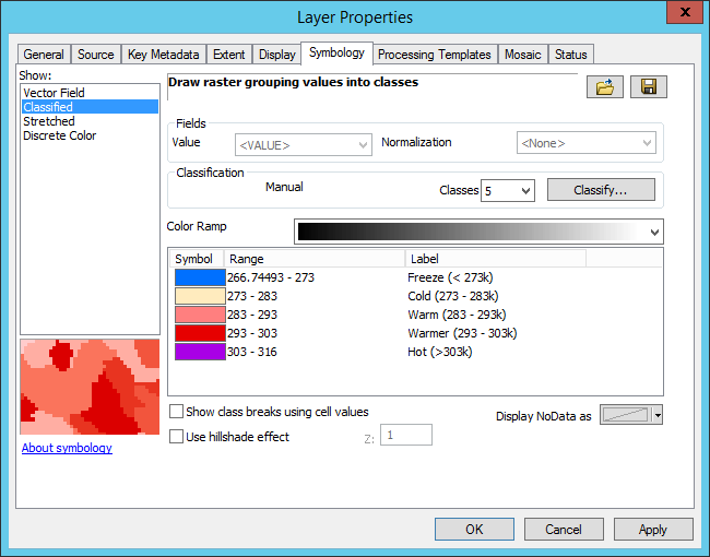 When visualizing continuous data such as temperature and salinity in ArcGIS Online, sometimes you may want to configure a few rendering templates with specific color ramps or breaks. While you can achieve the goal by way of the Stretch function, Remap function, Attribute Table function, Color map function, etc, you can also do it directly from the Symbology window in ArcMap.