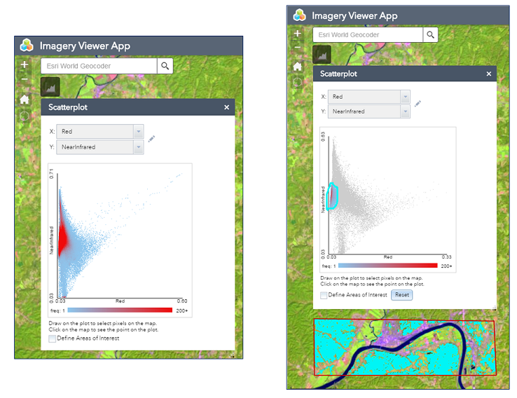 The latest update also includes a Scatterplot widget, which allows an end user to select two bands from an image service layer and plot their values on a graph.
