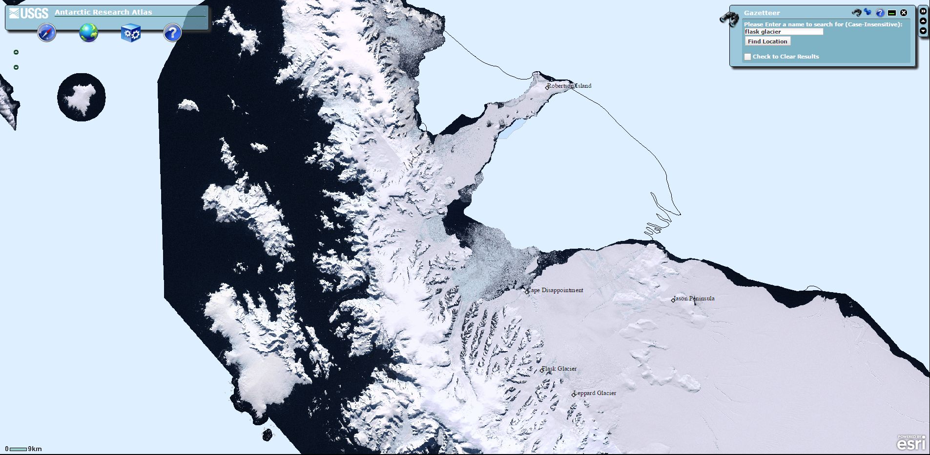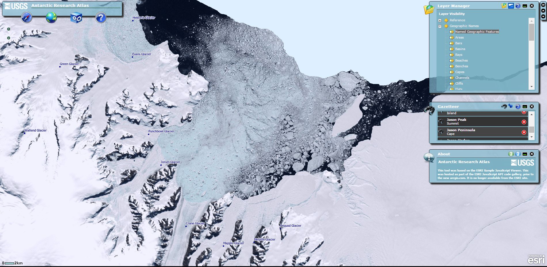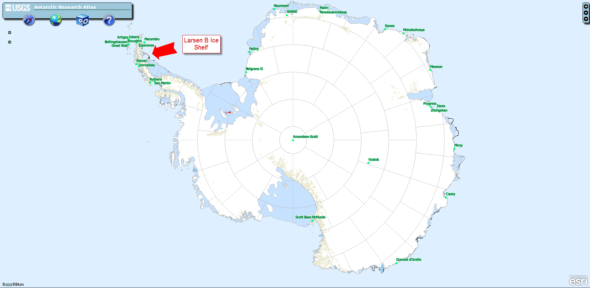The Antarctic Research Atlas displays a treasure trove of high resolution imagery for Antarctica with easy to use tools, such as a gazetteer (geographical dictionary helpful for searches), which was invaluable for actually pinpointing the location of the Larsen B Ice Shelf.
