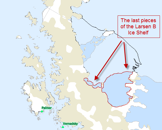 Antarctica…one of the last wilderness frontiers. With all the talk in the news these days about the Larsen B Ice Shelf in Antarctica breaking apart, I thought I’d see what information I could find out about it from an imagery perspective. It turns out just figuring out where the named ice shelves are located is a feat that requires not only looking at imagery, video, old maps, named geographical features, but also reading the description of where it should be and looking at line drawings to finally pinpoint it. Antarctica is so vast that they haven’t even named all the natural features there, only a small fraction of them. During my search, I ended up reading and learning a lot about ice shelves, ice sheets, Antarctica, destabilization of glaciers and sea level rise.