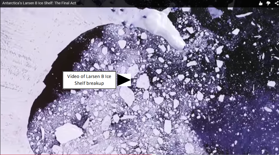 I had never heard about ice shelves [1] before, and I guess I always imaged what scientists were talking about were glaciers. But as anyone from a cold climate will tell you, there are many different ways to describe snow and ice. ‘Antarctica’s ice shelves are like cliffs of ice that extend from the shelf of the continent out into the ocean. Without ice shelves to impede their movement, Antarctic glaciers flow into the ocean at much faster rates, accelerating global sea level rise’.[2] That is not good news. As for the Larsen B Ice Shelf, respected scientists think it will completely break apart this decade.