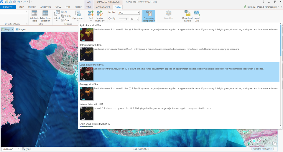 To take advantage of the archive, we’ve designed a number of pre-defined band combinations and indices. You can find these from the Data tab, under Processing Templates.