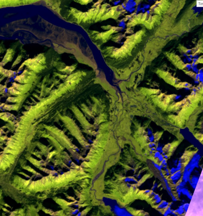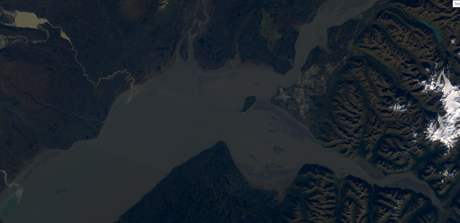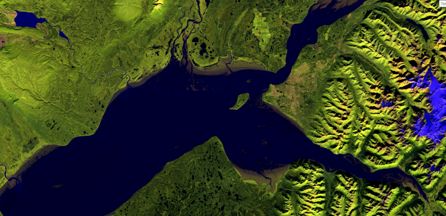 Above and below are images of Anchorage. You can see the cold, glacial melt rivers cutting through the sediment on the western side of the bay. The top image uses bands which can penetrate shallow water, revealing coastal bathymetric information. You also get a sense for why Anchorage is where it is. It’s not sitting on a sponge and the mountains to the east protect it to some degree from precipitation. The bright blue stuff below is ice.