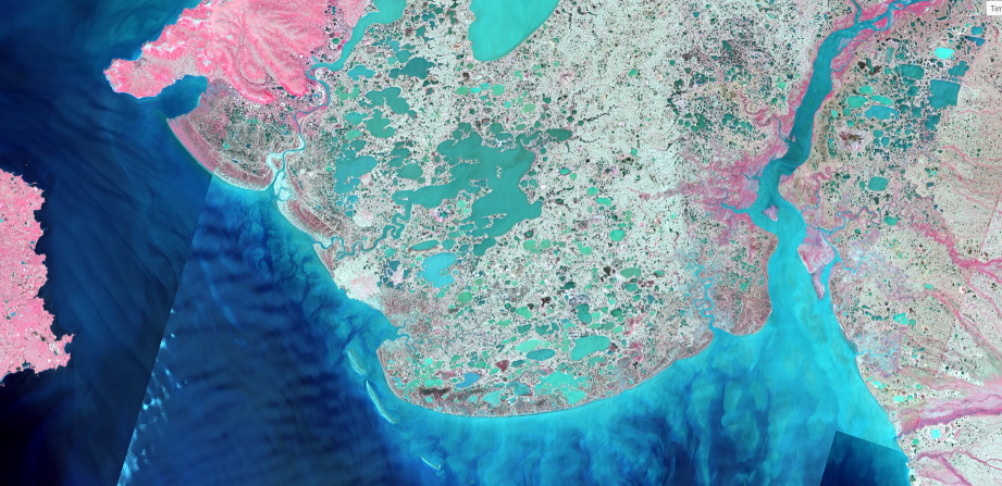 The image above is from far western Alaska with Nunivak Island at the far right of the image. I’ve never seen vegetation look pink in a false color image before. I have no idea why it looks this way. Feel free to take me to school in the comments.