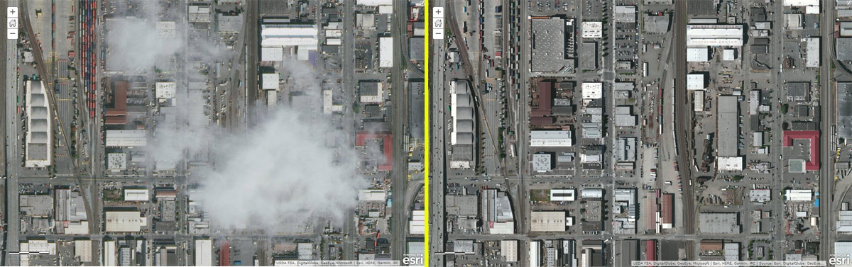 The area shown below is near Seattle, Washington. Clouds and cloud shadows can be seen in the World Imagery on the left. On the right is the same location, but using World Imagery Clarity. The imagery may not be as recent, but is obviously more clear.